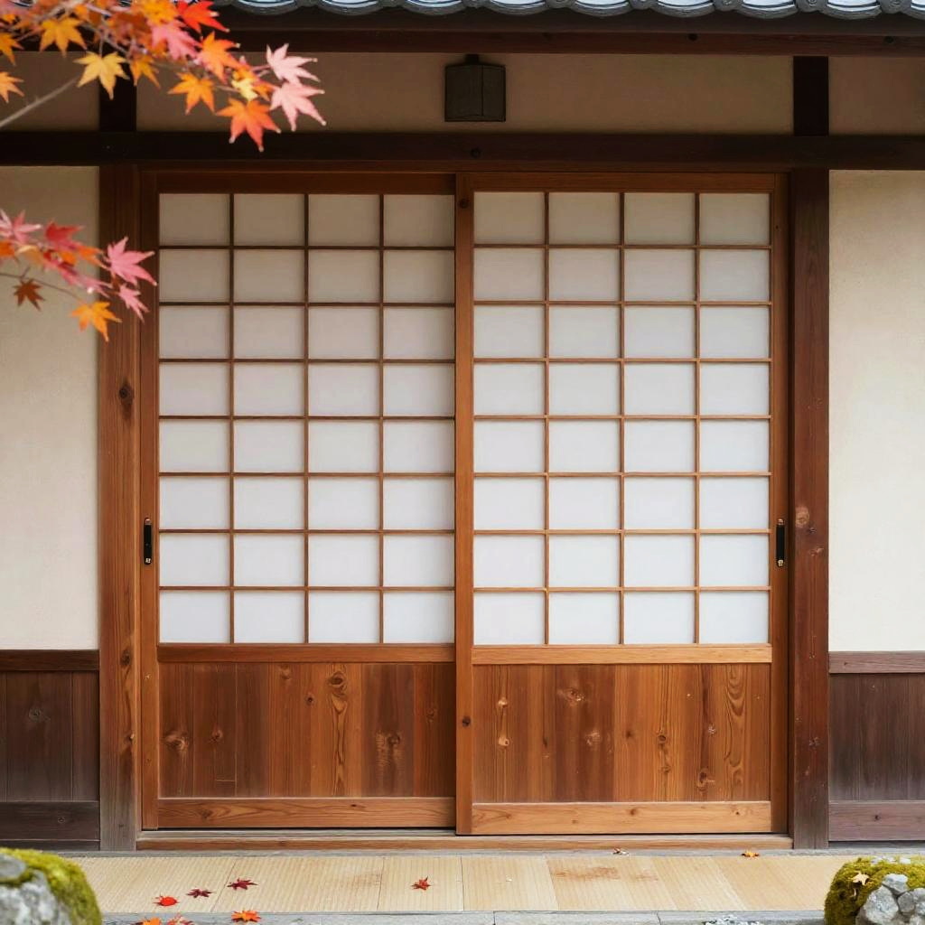 Japanese front door entrance showcasing shoji screen doors with frosted rice paper, framed by natural cedar wood, colorful autumn maple leaves scattered on the ground nearby.