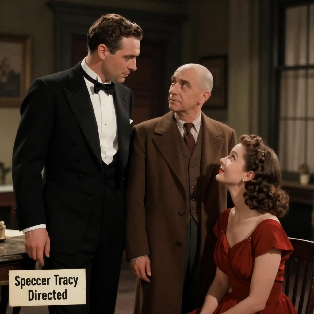 1930s movie still. Blonde woman in dark red dress and beret stands between older man in blue suit and young girl in blue dress and hat. Grand piano in background. Woman points at girl, who looks up at her. Intense expressions.