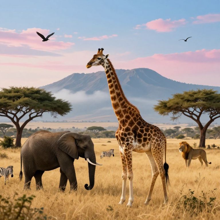 In this surrealistic savanna landscape, a majestic giraffe stands tall, its long neck and spotted coat contrasting against the golden grasslands. To its left, an elephant, with its massive gray body and trunk, appears to be grazing peacefully. A zebra, with its distinctive black and white stripes, is seen in the distance, adding to the diversity of wildlife. Above, a lion, with its sleek body and mane, prowls the savanna, its gaze fixed on the horizon. The scene is framed by acacia trees and scattered bushes, their shapes and textures adding depth to the landscape. In the background, a majestic mountain range rises, its peaks shrouded in mist, creating a sense of grandeur and mystery. The sky above is a mix of soft blues and pinks, with birds soaring freely, their silhouettes adding a dynamic element to the scene. The overall composition is balanced, with each element carefully placed to create a harmonious and visually captivating image.