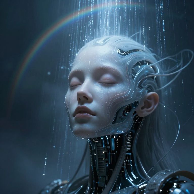 Create a surreal and ethereal portrait that fuses fragmented human forms with intricate metallic elements and luminous, flowing textures, The figure appears deconstructed, with parts of their body dissolving into swirling patterns of light and liquid-like metal, Their face is partially obscured by iridescent, biomechanical structures that resemble a fusion of organic vines and sleek machinery, glowing softly with hues of silver, blue, and violet, The backdrop is an abstract dreamscape, with shimmering light fractals and misty gradients blending into an infinite horizon, The figure’s posture is graceful yet mysterious, as if caught between worlds, with textures of smooth metal, translucent skin, and delicate, flowing fabrics harmonizing seamlessly, The atmosphere is otherworldly, emphasizing a balance between beauty and distortion, organic life and mechanical perfection, evoking a haunting yet mesmerizing futuristic aesthetic, CynthiaPortrait