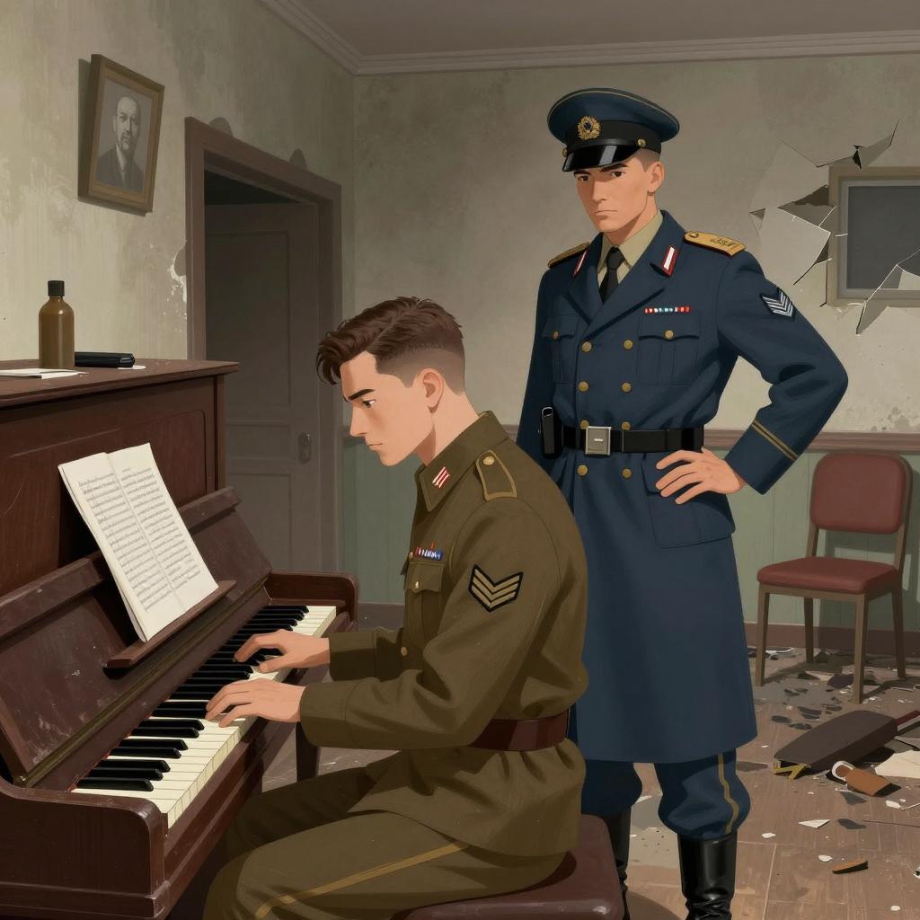 Illustration of two men in a war-torn room. One man with brown hair, in a brown military uniform, sits at a broken piano. The other man, in a blue military coat and black cap, stands with his hands on his hips. The room is filled with debris, shattered walls, and a red chair in the background.