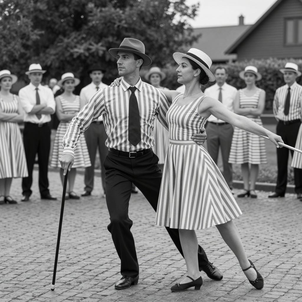 Black-and-white photograph of a dance competition. Male dancer in striped shirt, tie, and pants, wearing a hat, holds cane. Female dancer in striped dress, sleeveless, and hat, holds cane. Both in mid-dance pose. Background: audience in striped outfits, some in hats, standing. Trees, houses, and a path in the background. 10 people in total, including dancers. Dancers' expressions focused. Cobblestone ground.