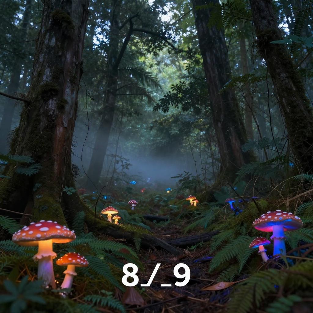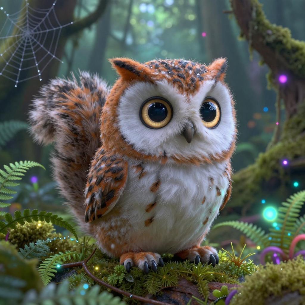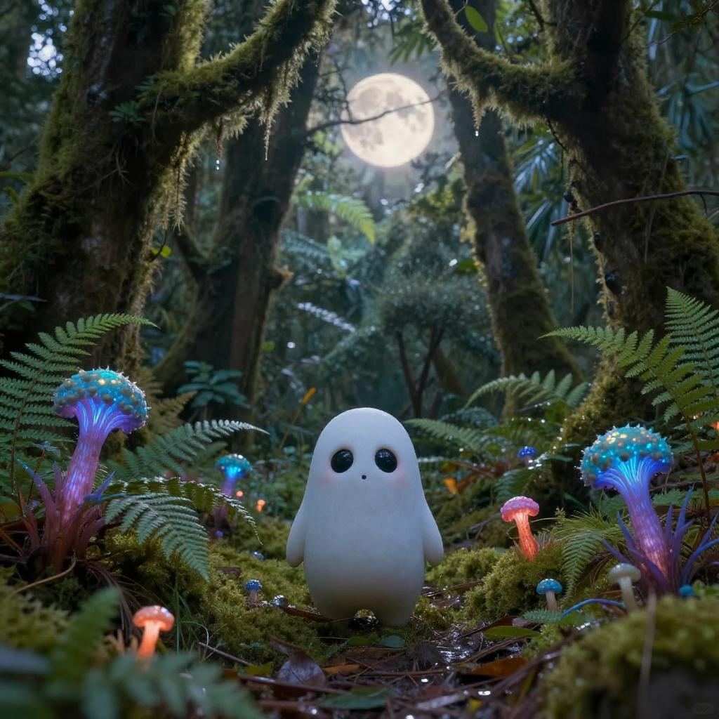 Score_9, score_8_up, score_7_up, realistic:cinematic photorealism, cat, whimsically cute, spooky and lush forest at twilight with hanging lanterns, bioluminescent ferns and drifting mist, vivid, neon-accented colors