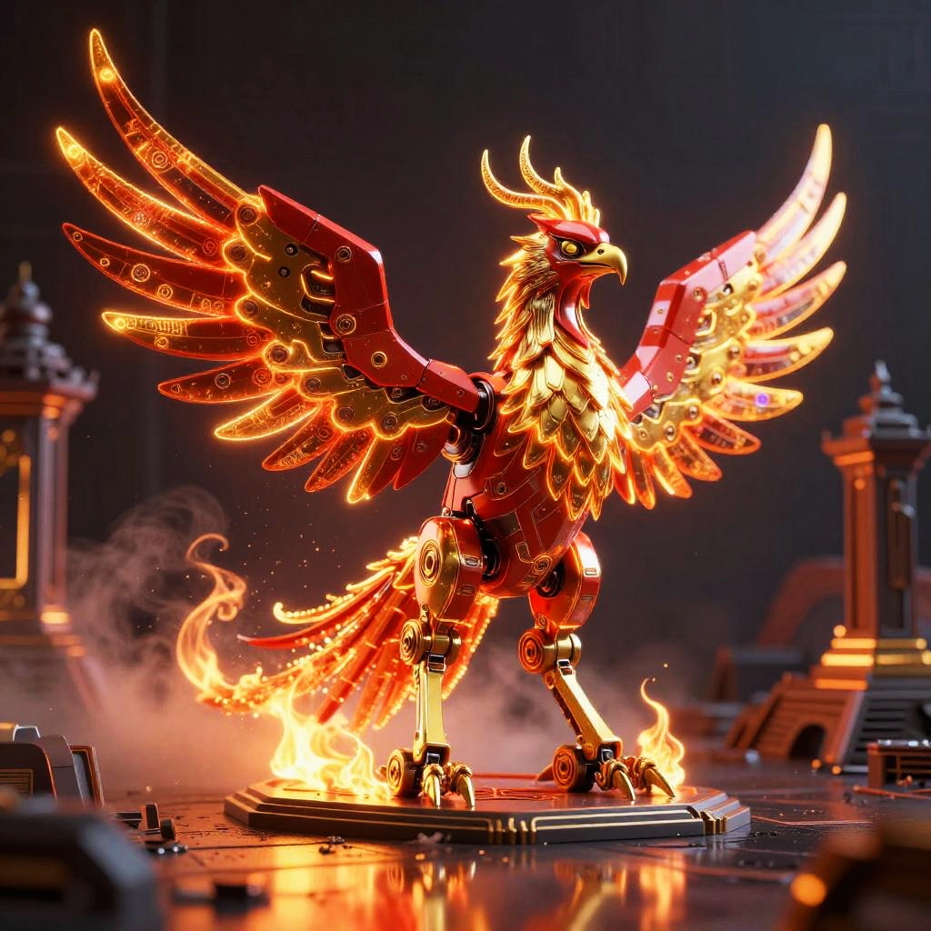 3D robotic phoenix, rendered in a futuristic neon theme within flaming neon temple ruins with electric embers, glowing edges and dynamic reflections, dark abstract background with subtle geometric patterns, high-poly hard-surface detail, calibrated color grading, volumetric fog, rim lighting, soft bloom, global illumination, ambient occlusion, reflective wet floor, ultra sharp microdetail, octane/unreal look, accented by bright scarlet and blazing gold, depth of field, noise-free finish