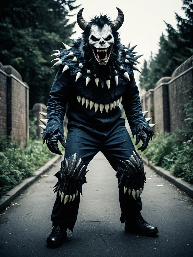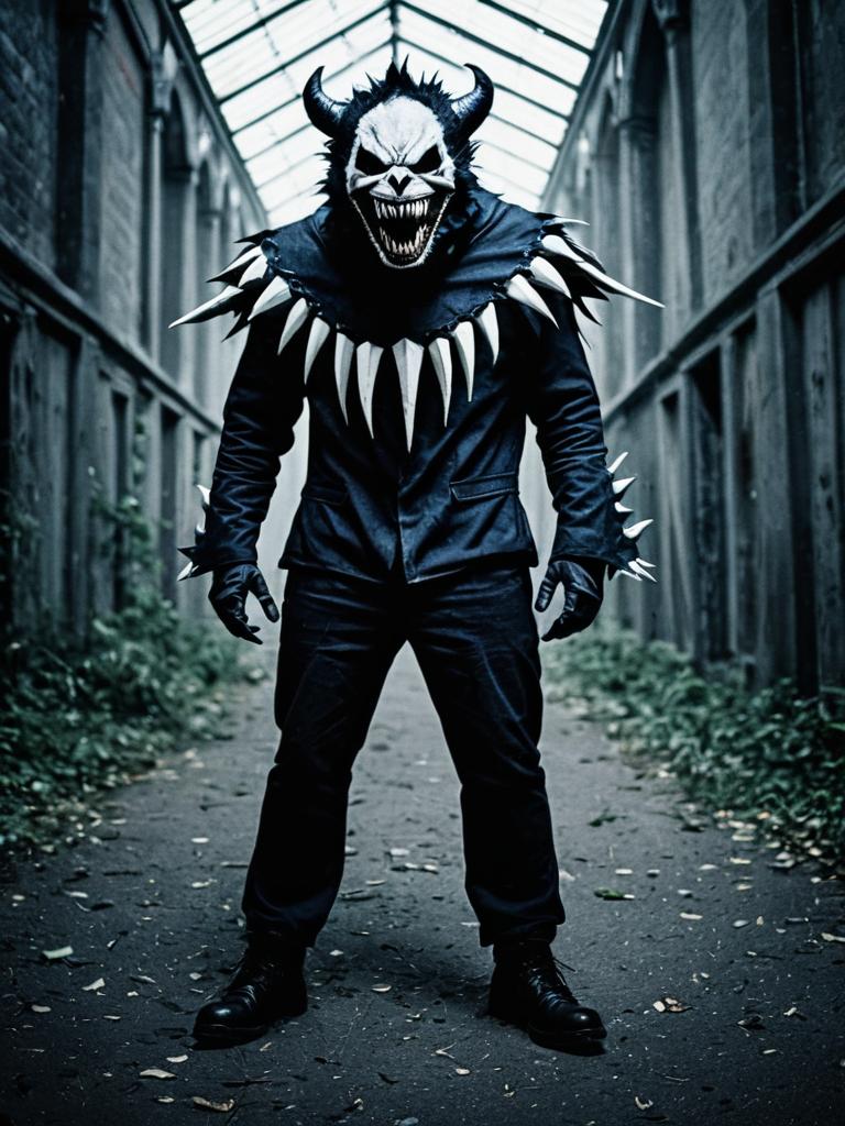Man in Beast Teeth Costume, full-body cosplay photo in horror setting