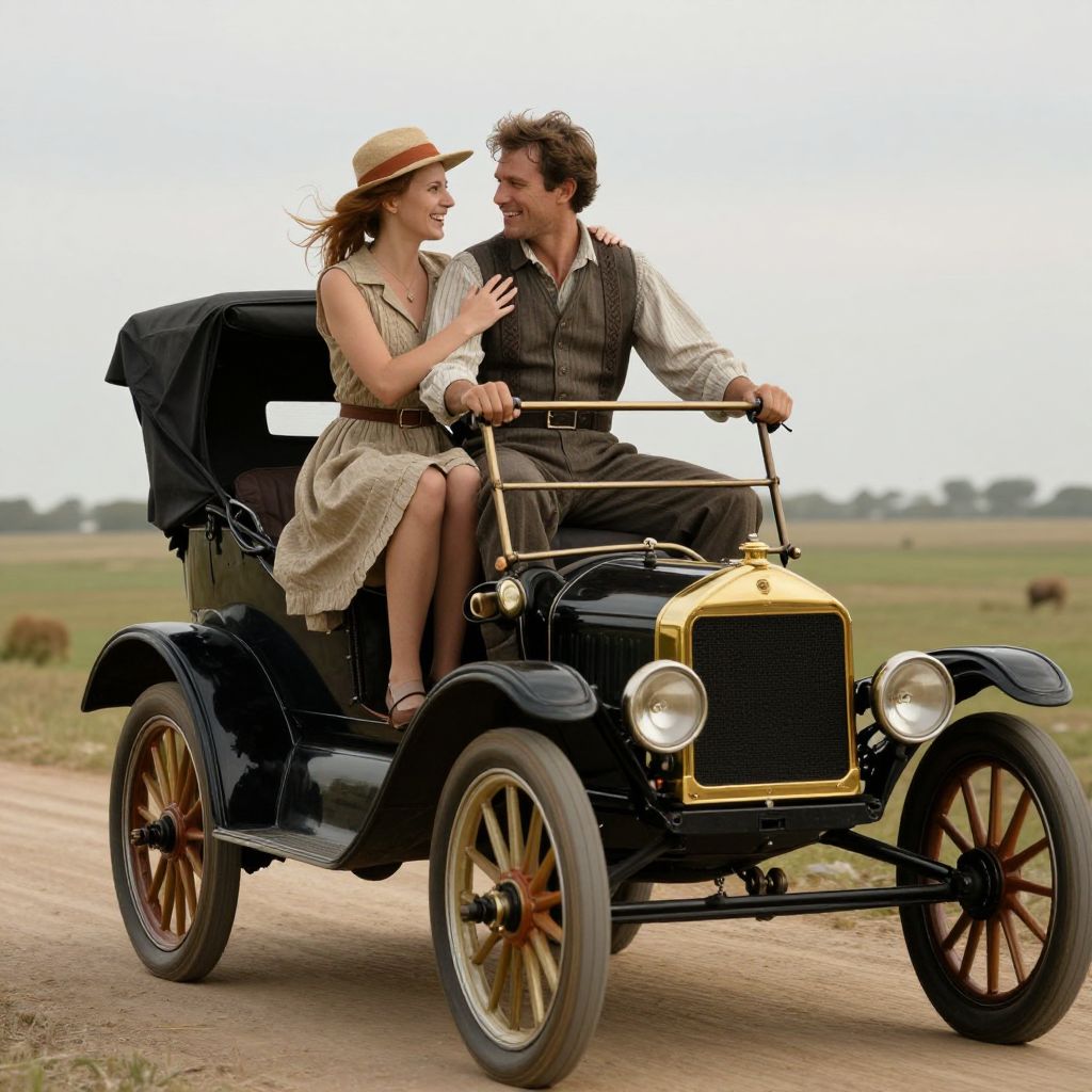 Riding through the echoes of history, a man and woman embrace the timeless spirit of adventure, their laughter mingling with the gentle hum of the vintage Model T, as freedom and nostalgia intertwine beneath the open sky.