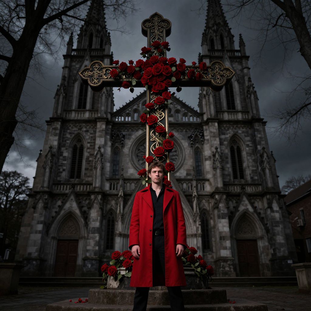 Photograph of a mournful man in a red coat, standing before a Gothic cathedral, holding a cross adorned with red roses. Dark, stormy