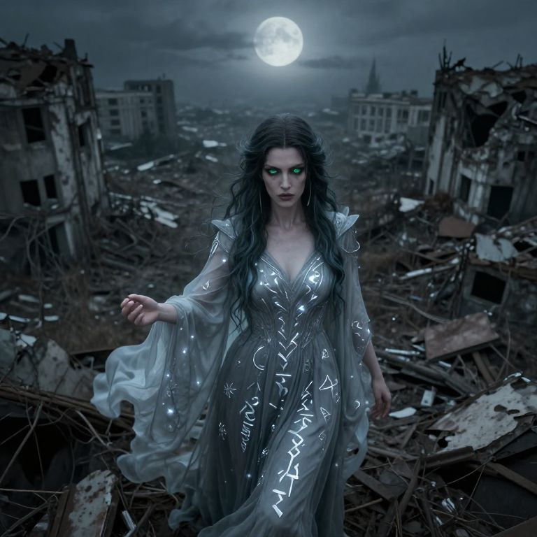 A haunting portrait captures an enigmatic elven sorceress with piercing emerald eyes, her ethereal beauty juxtaposed against the backdrop of a barren, dystopian cityscape ravaged by war and decay. The scene is viewed from an unusual aerial perspective, revealing the paradoxical fusion of nature reclaiming its dominion over the ruins and the sorceress's powerful arcane presence. She stands amidst the debris, her flowing robes adorned with shimmering silver runes that reflect the eerie glow of the moon, evoking an emotional gradient ranging from hopelessness to a glimmer of potential redemption as she channels her magic into restoring life and vitality to this desolate landscape.