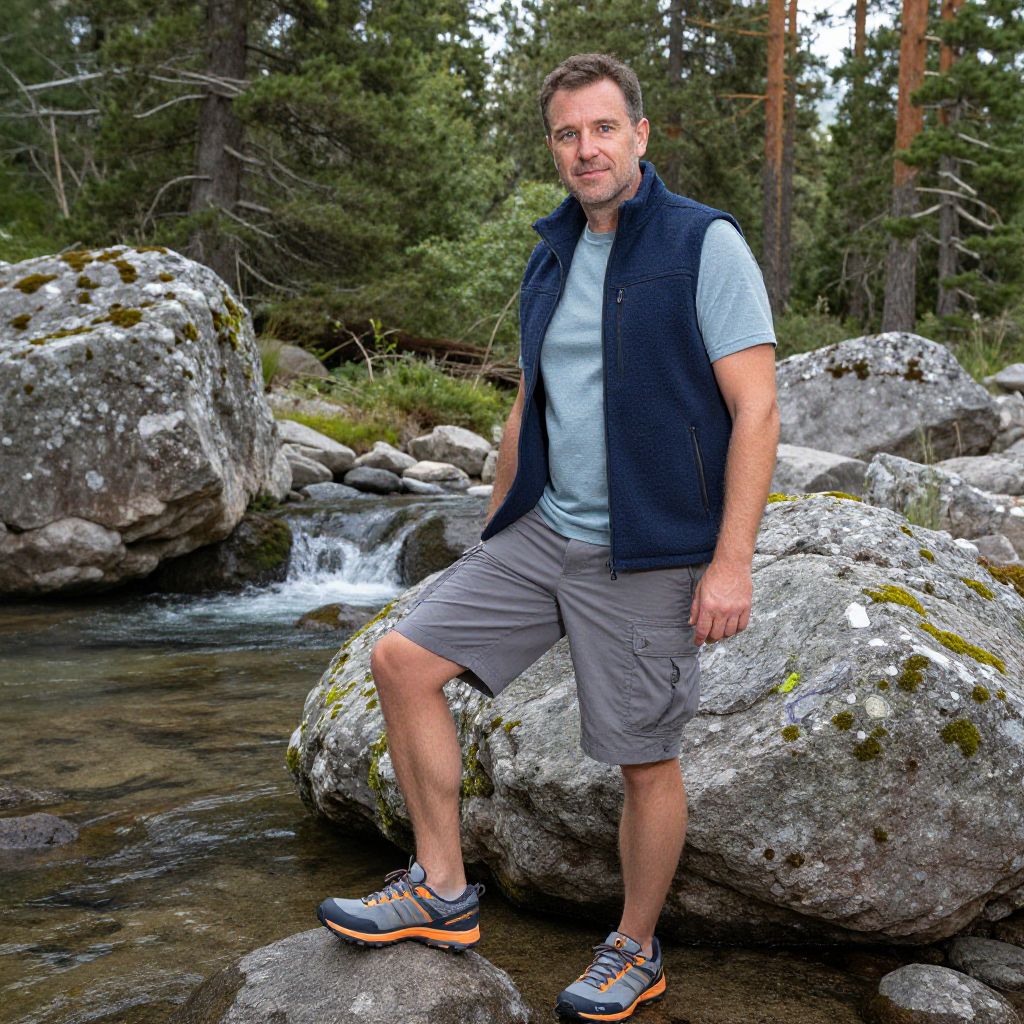 A man, lightweight moisture-wicking t-shirt, durable cargo shorts, insulated fleece vest in navy, breathable trail running shoes in gray and orange, crystal-clear water, moss-covered boulders, towering pine trees, disposable camera style, relaxed smile, enjoying nature. Man has masculine face and piercing eyes