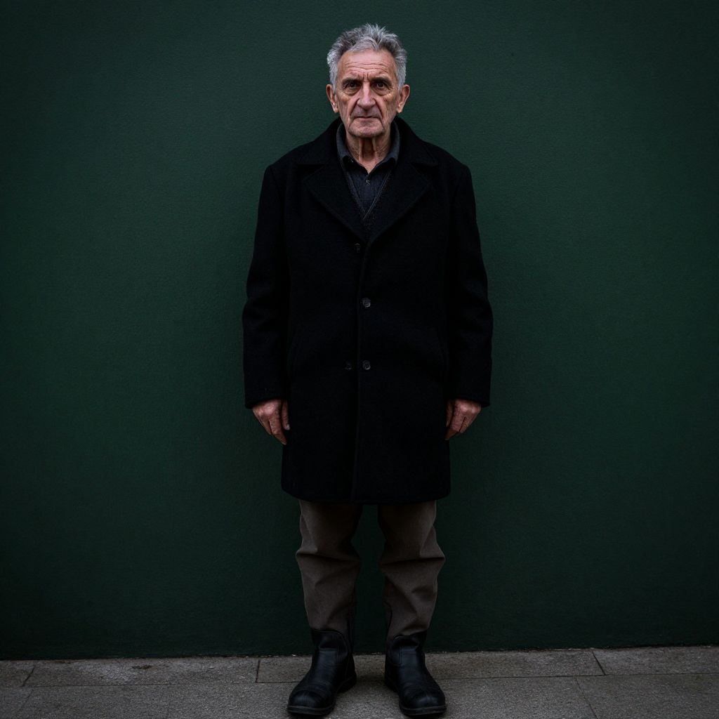 Photograph of an elderly man with short, gray hair and a solemn expression, standing against a dark green background. He is wearing a black, double-breasted overcoat, a black shirt, brown pants, and black shoes. The lighting is stark, highlighting his weathered face and wrinkles. The floor beneath him is concrete, and he stands centered, facing the camera. The overall mood is serious and somber, with a minimalist, almost cinematic style.