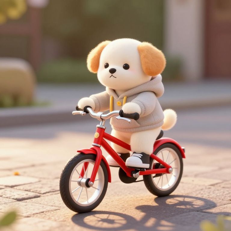 A whimsical 3D-rendered scene depicts a charming anthropomorphic puppy dressed in a cozy hoodie and sneakers, riding a vibrant red bicycle with glowing wheels, illuminated by a warm, golden-hour light that casts enchanting shadows on the cobblestone path, blending fantasy with a playful, cartoonish aesthetic.