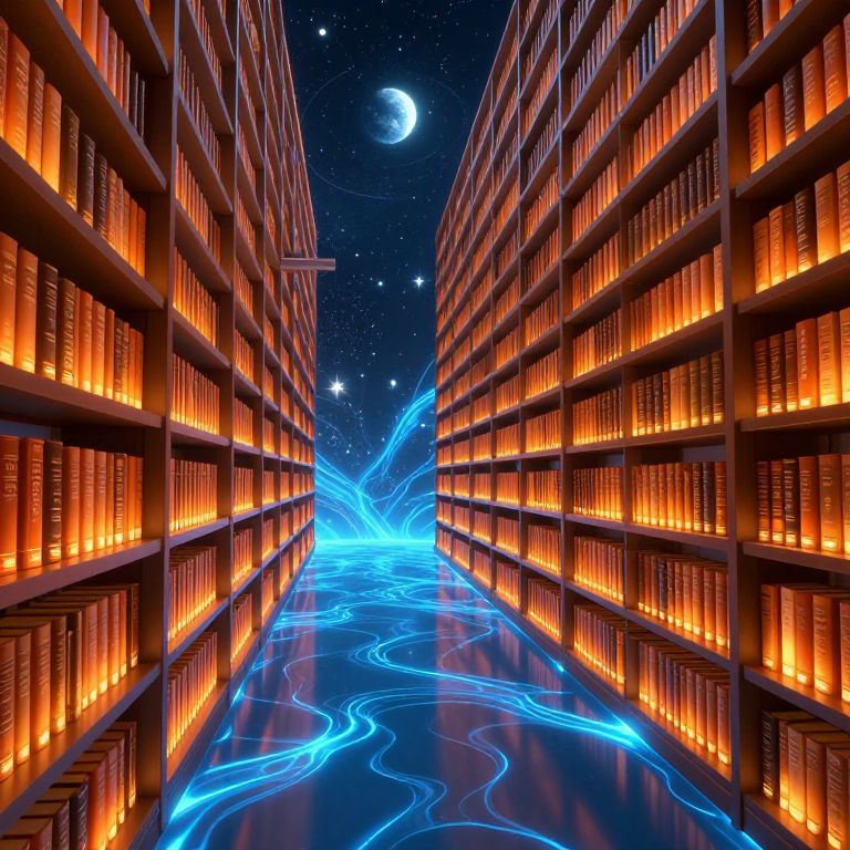 Digital artwork depicting a narrow, endless library aisle with towering shelves of warmly lit, orange-glowing books on both sides. The floor reflects the glowing bookshelves, creating a sense of depth. In the center, vivid blue, neon-like light trails weave through the aisle, leading toward a starry night sky with a crescent moon. The contrast between the warm bookshelves and the cool blue light creates a magical, otherworldly atmosphere. The scene is symmetrical and immersive, with a futuristic, fantasy-like style.