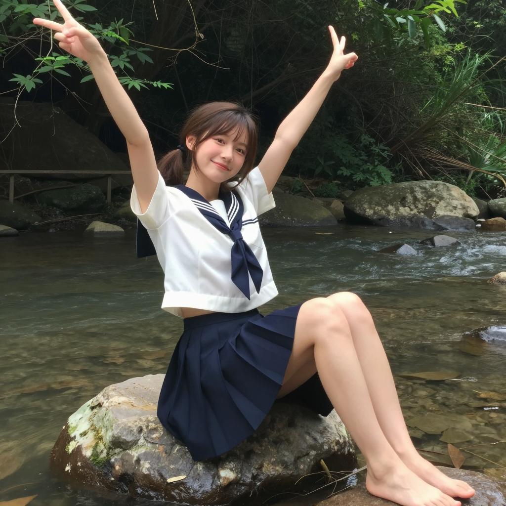 Asian girl with long brown hair in ponytail, sitting on rock by river, wearing white sailor top and navy pleated skirt, arms raised, making a peace sign, barefoot, green forest background, daytime, photograph, bright natural light, relaxed pose.