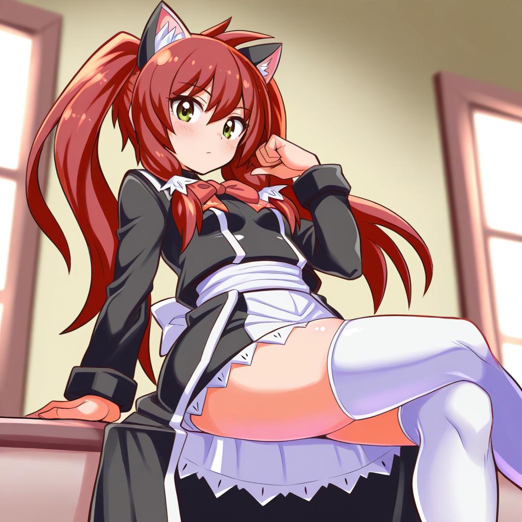 Illustration of an anime-style girl with red twintails and cat ears wearing a black and white maid outfit with white thigh-high stockings. She has green eyes and a slightly blushing expression, sitting indoors near windows with soft light.