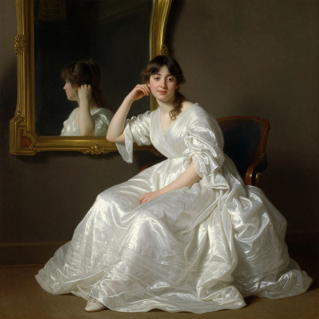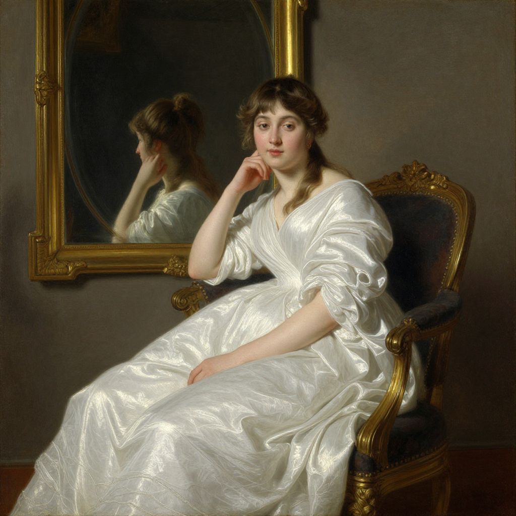 This is a classical oil painting depicting a young Caucasian woman with fair skin and brown, wavy hair, seated in an ornate, dark blue upholstered chair with gold trim. She wears a white, silk gown with flowing, shiny fabric that catches the light. Her left hand rests on her cheek, and she gazes thoughtfully into a large, gold-framed mirror behind her, which reflects her profile. The background is a dark, muted wall, highlighting the subject. The woman's expression is serene and contemplative, and the overall style is reminiscent of 18th-century portraiture, emphasizing elegance and refinement.