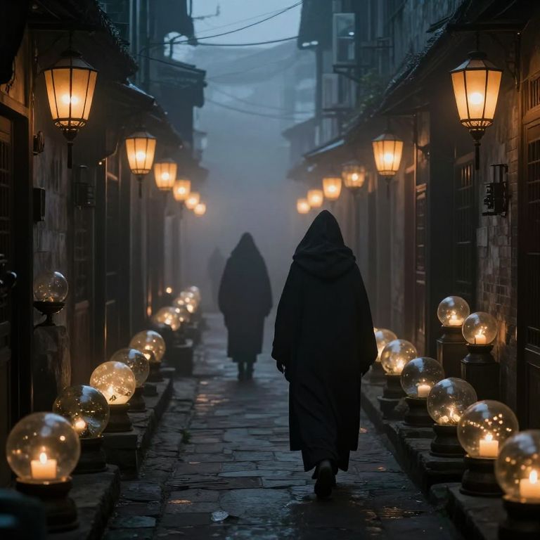 Photograph of a narrow, cobblestone alley at dusk, illuminated by warm, glowing lanterns hanging from both sides. The alley is lined with spherical, glass-encased lights. A solitary, hooded figure in dark, heavy clothing walks away from the camera, centered in the frame. The background is shrouded in mist, adding a mysterious, atmospheric quality. The scene is dimly lit, with the lanterns casting a soft, orange-yellow glow on the wet cobblestones. The alley is flanked by dark, weathered buildings with subtle, visible textures and details.
