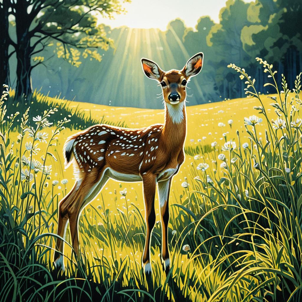 Detailed illustration of a gentle fawn standing in a vibrant sunlit meadow surrounded by tall grass and wildflowers. The scene features intricate line work and vibrant colors, highlighting the natural setting with sunlight streaming through trees in the background.
