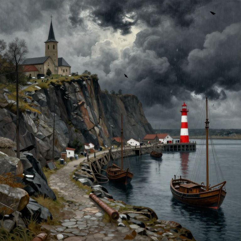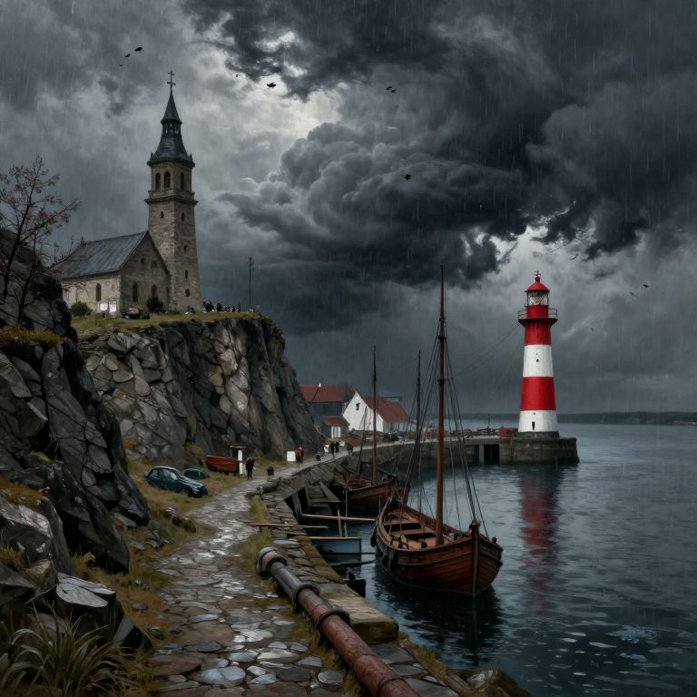 This digital painting depicts a stormy coastal scene with a dramatic, dark sky filled with heavy, gray clouds. On the left, a tall stone church with a black spire stands on a rocky cliff. Below, a narrow, wet cobblestone path leads to a small harbor with two wooden sailboats tied to a dock. In the background, a bright red and white striped lighthouse stands on a stone pier, reflecting on the choppy, dark blue water. A white house with red roofs is nestled between the cliff and the lighthouse. Raindrops are visible, adding texture to the scene. Birds are flying in the stormy sky.