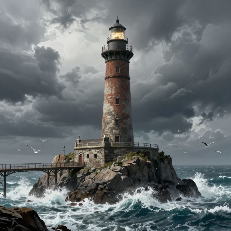 Dramatic photograph of a stormy seascape featuring a red and white lighthouse, rocky cliff with a church, and moored sailboats.