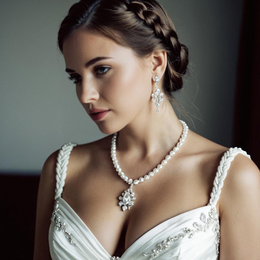 Anastasia komori,1girl, solo, dress, earrings, jewelry, realistic, brown hair, blurry background, blurry, white dress