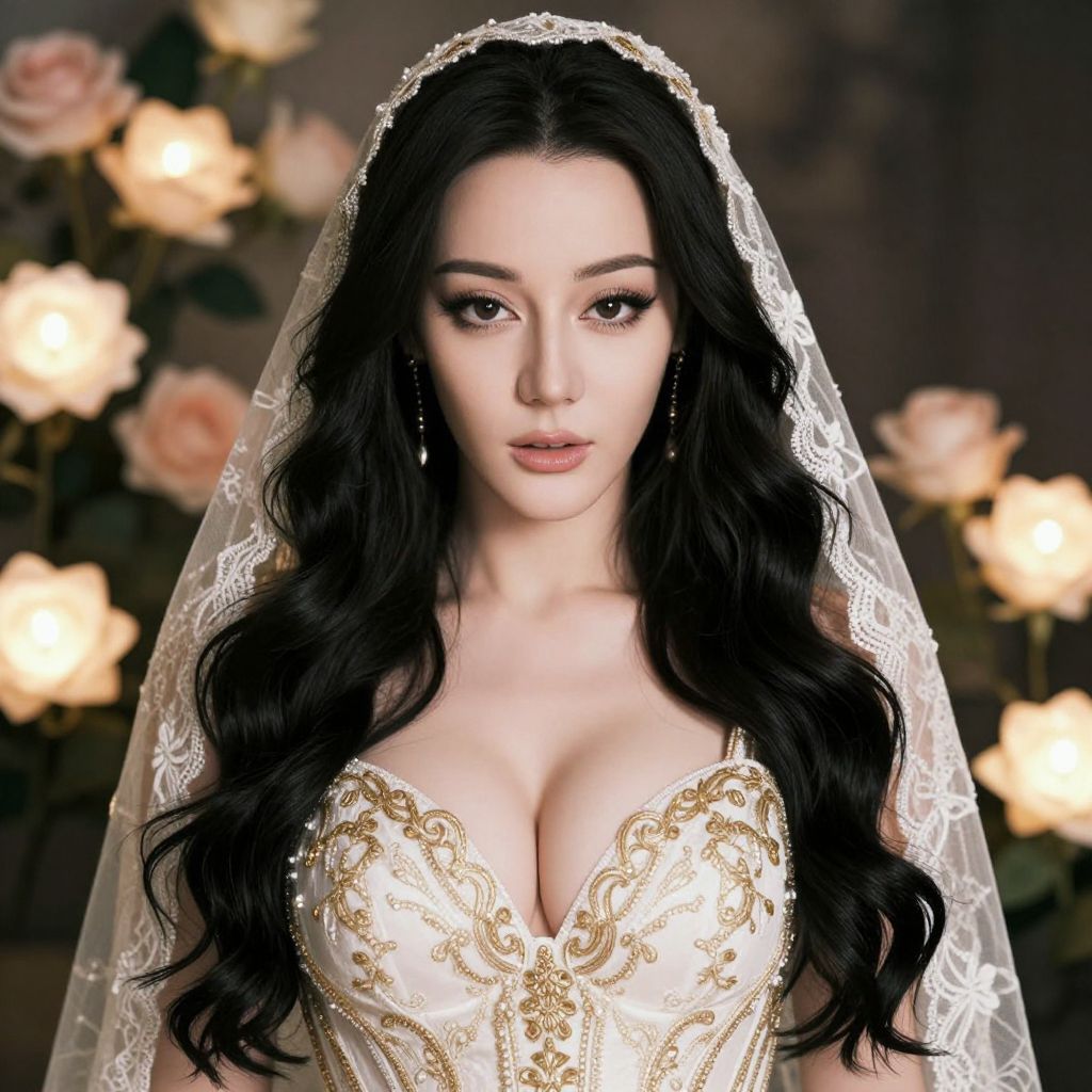 This is a digitally created image of a beautiful woman with long, wavy black hair and fair skin. She's wearing a white, low-cut dress with gold embroidery and a lacy veil. Her large breasts are prominently displayed. She has striking makeup with dark eyeliner and nude lips. She's surrounded by soft, glowing roses in the background. The overall vibe is elegant and romantic.