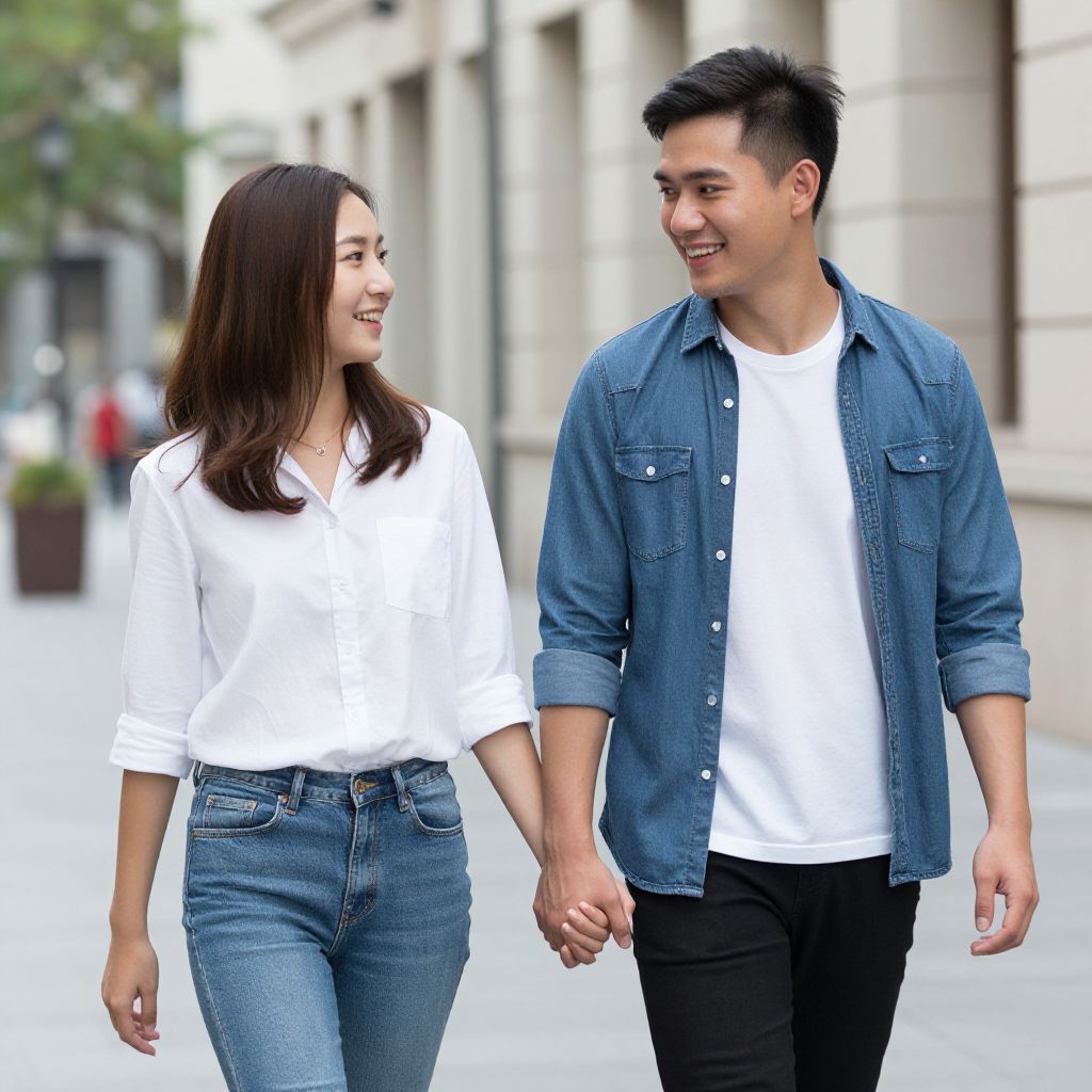 A photograph of a smiling Asian couple walking hand-in-hand on an urban street. The woman, with long black hair, wears a white t-shirt, blue jeans, and a light pink cardigan. The man has short black hair, wears a white t-shirt, black pants, and a light blue denim jacket. The background is slightly blurred, showing modern buildings and a few cars. The couple's casual, trendy outfits and their warm expressions suggest a happy and relaxed moment. The image is bright and natural, with a focus on the couple's connection.