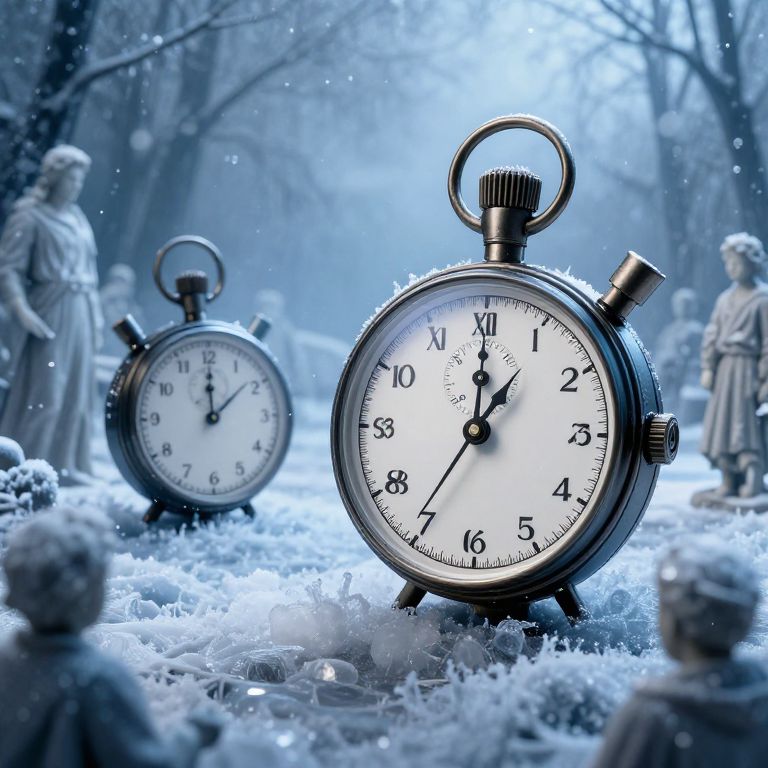 Timekeepers wage a war of chronometers in a valley of frozen seconds, where every ticking hand battles to control the movement of an audience of statues.
