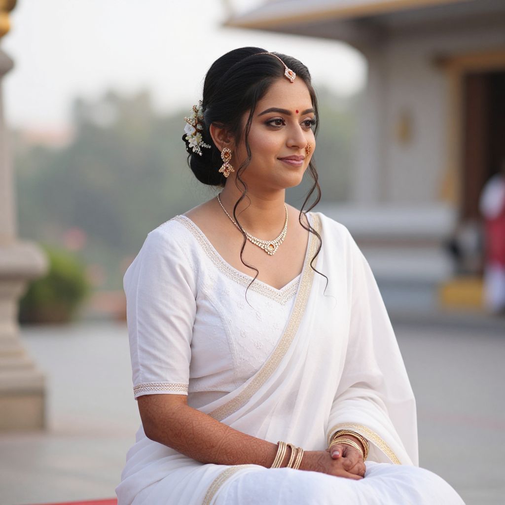 A natural, candid-style photo of an Indian bride with a thin, elegant hairstyle featuring twisted strands and a hairpin with a floral design, dressed in a classic white cotton bridal costume, sitting in a well-lit temple courtyard during an early morning wedding ceremony, her face glowing with a peaceful smile.