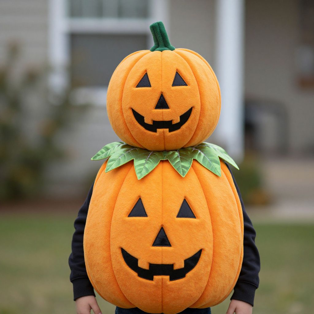 Photograph of a person wearing a large, orange, two-tiered carved pumpkin costume with green leafy stem, smiling jack-o'-lantern faces