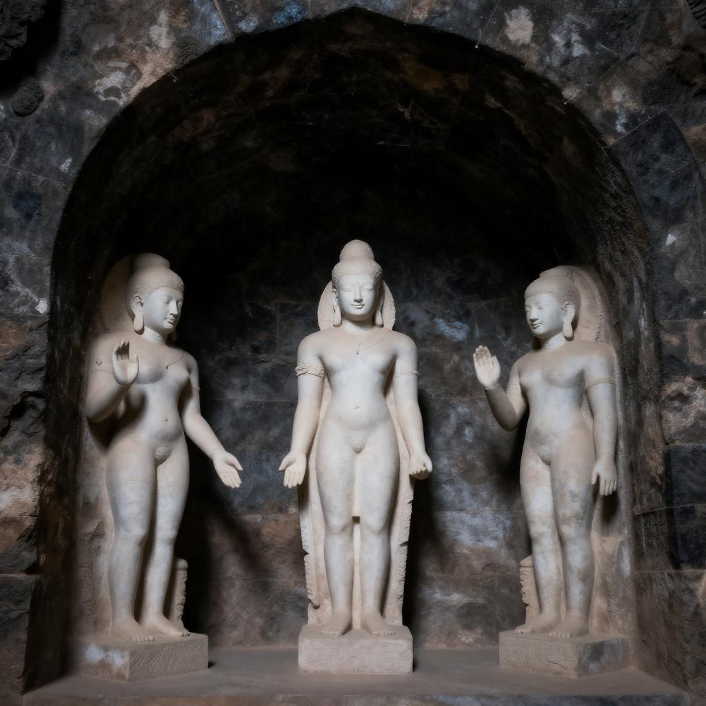 Photograph of a dark, arched stone cave with three white statues. One statue stands in the center, another near the left, and the third raises an arm to the right. Shadows and light create dramatic contrasts.