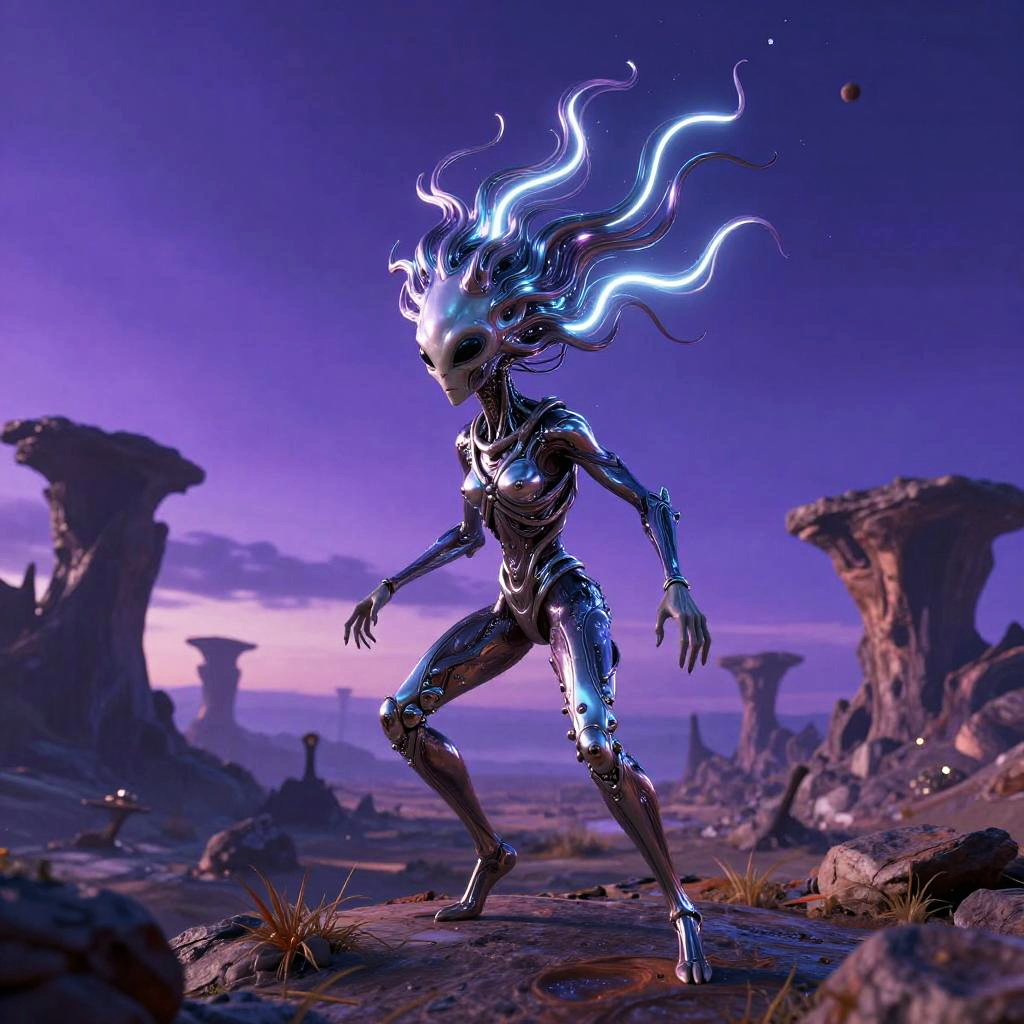 Dynamic scene depicting an alien with a gravity-defying hairstyle composed of liquid metal and light ribbons, set on an alien planet with unusual rock formations and a vivid purple sky during an eerie dusk.