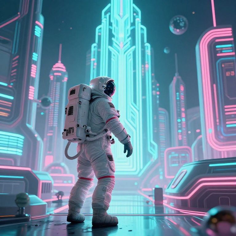 Retrofuturistic Astronaut in Alien Metropolis