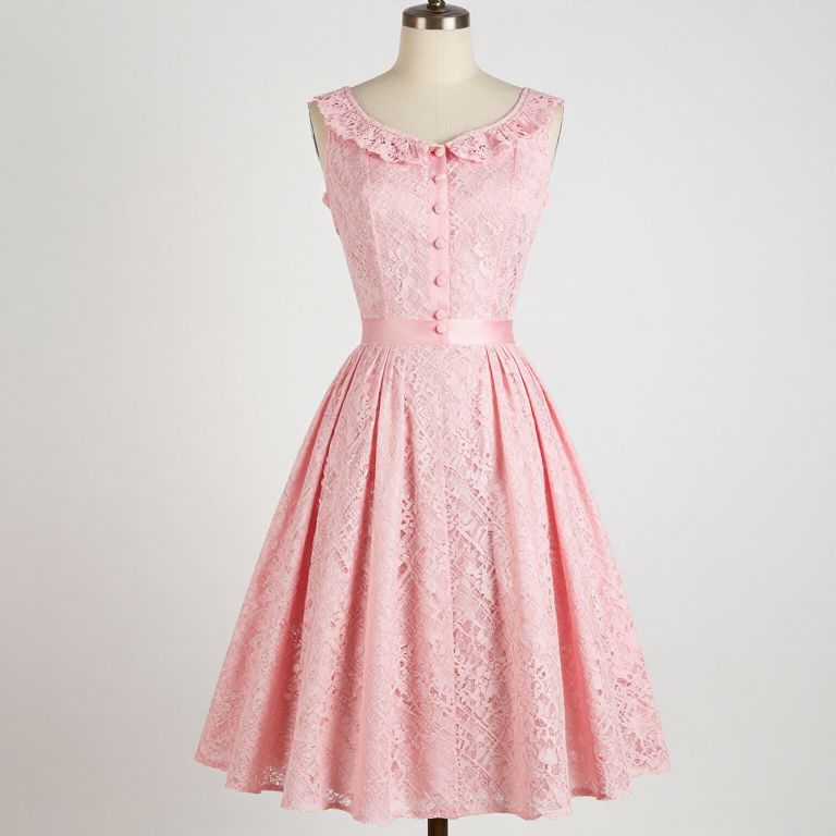 Vintage 1950s pink lace evening dress displayed on a mannequin, featuring a fitted bodice with front buttons and a flared skirt, showcased against a plain white background.