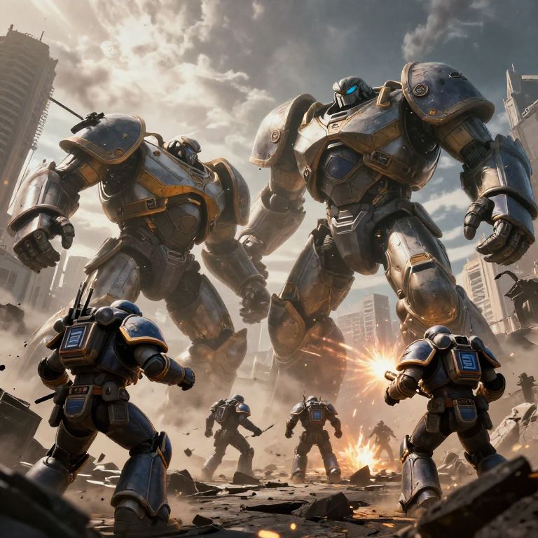 Snk, epic battlefield scene with towering titans clashing against armored soldiers in a ruined cityscape, dynamic lighting, intense action, detailed character designs, dramatic clouds and smoke, cinematic perspective, high resolution