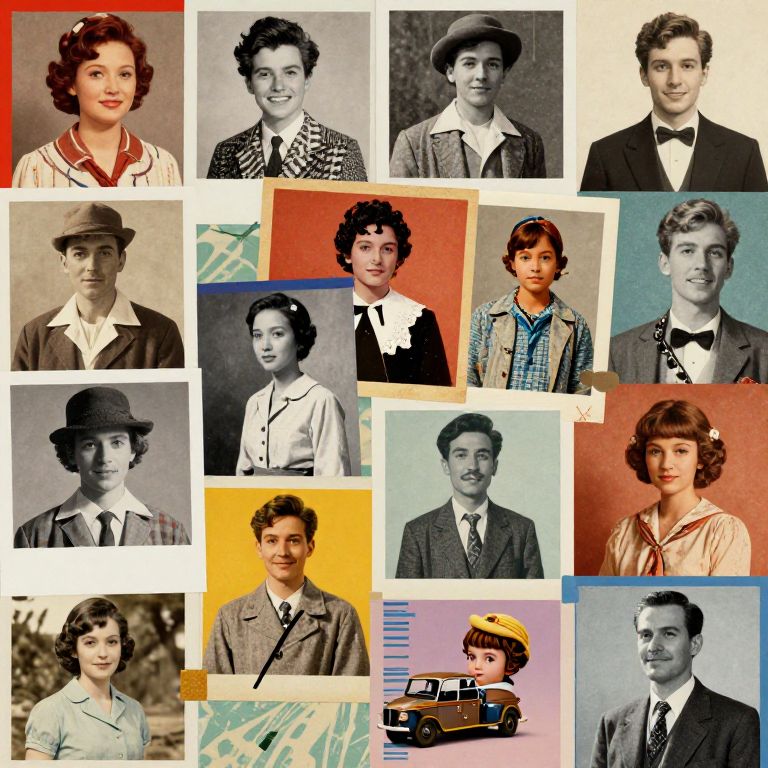 This is a collage of 16 vintage black-and-white and color photographs of individuals from the mid-20th century. The subjects include men and women with varied hairstyles, wearing clothing typical of the 1940s to 1960s, such as suits, hats, and patterned blouses. The backgrounds are mostly plain, with some featuring bold, solid colors like red, orange, and blue. The images include both formal and casual portraits, with some subjects smiling, while others have neutral expressions. A notable image in the center-right shows a small child in a yellow hat sitting in a toy car. The overall style is nostalgic, capturing the fashion and photography of the era.