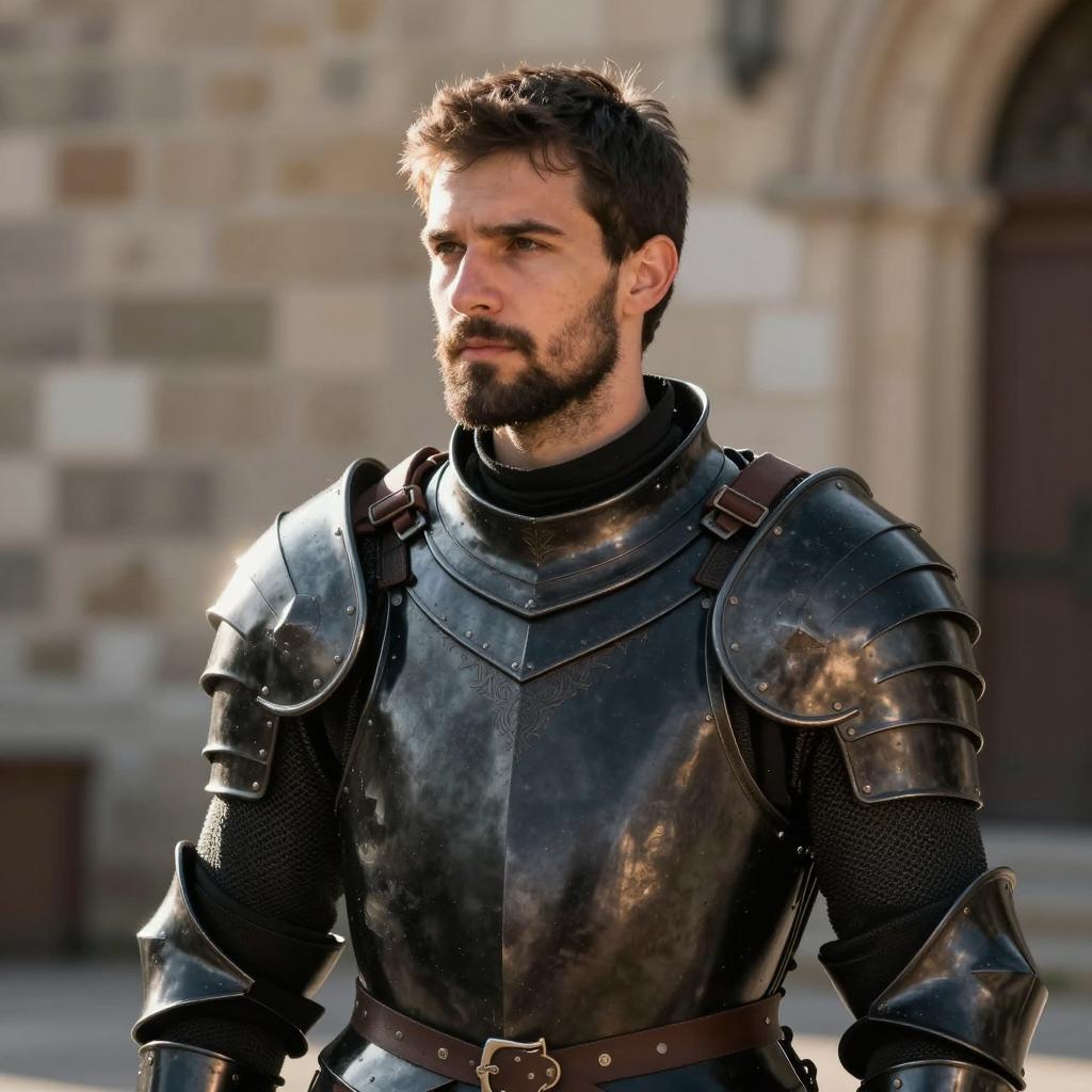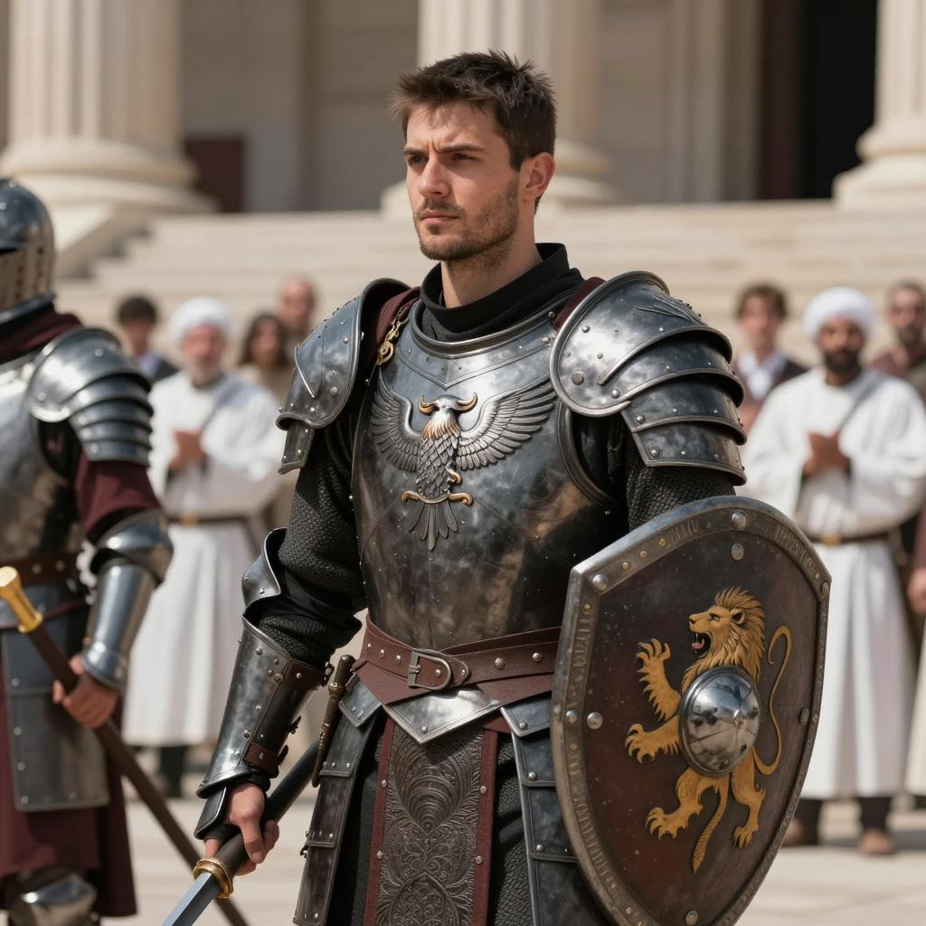 Photograph of a muscular man with short dark hair and beard, wearing wet, heavily armored metal armor, holding a sword in front of him. Behind him, a crowd of armed warriors with raised swords and determined expressions. Overcast sky with dark, moody lighting. Man in the foreground looks intensely forward, slightly upward. Multiple warriors in the background, some mounted on horses.