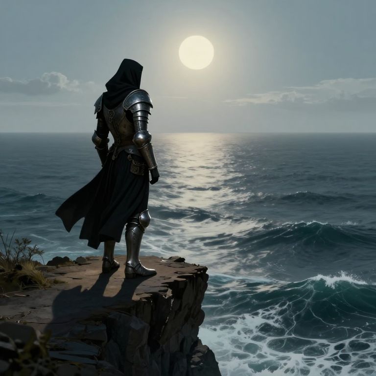 Envision a tranquil coastal vista illuminated by the mystical light of a full moon, where a lone figure stands at the water's edge, their outline distinct against the skyline. This intriguing character is clad in an elaborate diving attire, reminiscent of Jules Verne's submarine adventurers, adorned with gleaming metalwork and transparent windows that unveil the secrets beneath the waves. The unique vantage point not only captures the individual's enigmatic gaze into the ocean but also showcases the mesmerizing interplay of stars and moonbeams on its surface, merging the celestial expanse above with the hidden depths below in a surreal tableau that conveys both awe and solitude.