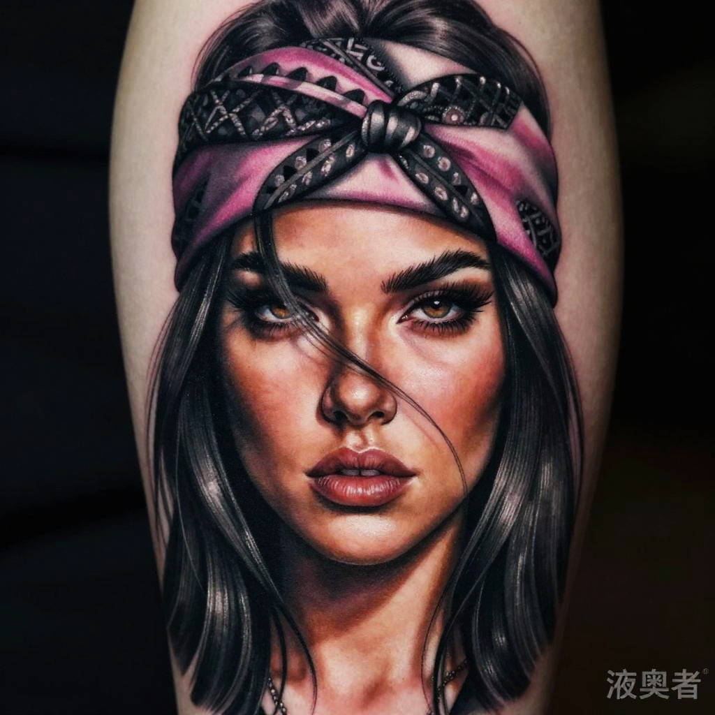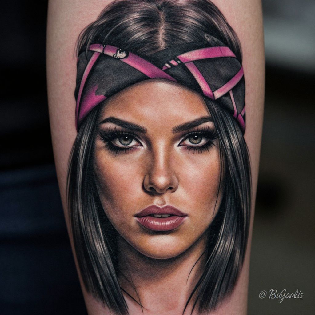 This is a highly detailed, realistic tattoo of a woman with dark, straight hair and intense eyes. She wears a black, patterned headband with pink highlights, and her expression is serious and slightly mysterious. Her hair partially covers her face, adding a touch of edginess. The background is blurred, focusing attention on the tattoo. The tattoo artist's watermark is visible in the bottom right corner.