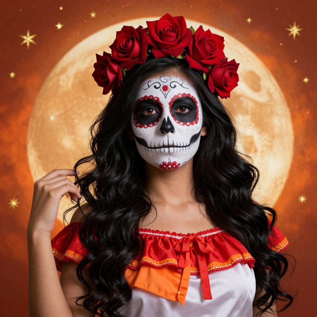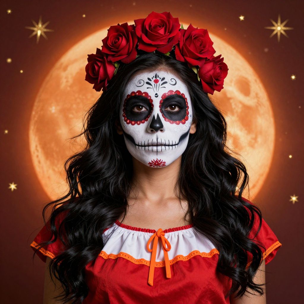 Vibrant depiction of a Dia de los Muertos-themed woman adorned with intricate sugar skull makeup, long flowing black hair crowned by six red roses, and dressed in a bold red and white blouse with orange accents, set against a radiant orange moon backdrop dotted with golden stars.