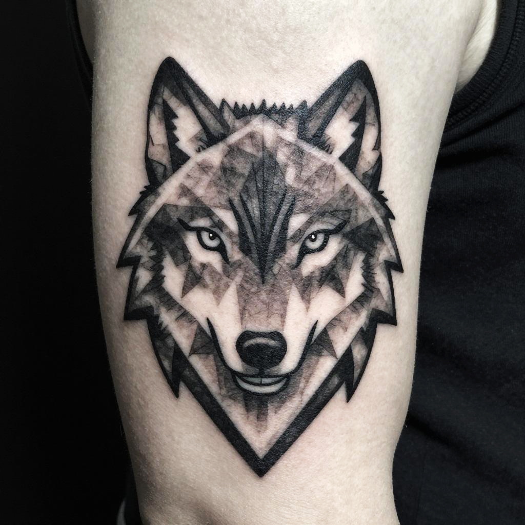Monochromatic tattoo composition of a geometric wolf head, emphasizing sharp lines and shading in grayscale, creating a striking contrast and abstract symmetry on upper arm.