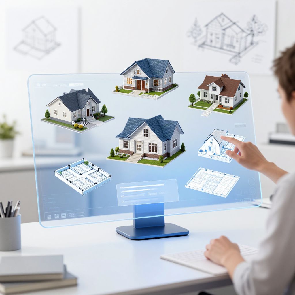House layouts maker interface displayed on a futuristic transparent touchscreen, vibrant 3D models of various house plans floating in midair, user interacting with plans, clean and bright workspace with architectural sketches and digital devices.