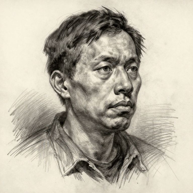 Black and white sketch of an Asian man with short, slightly messy hair, wearing a collared shirt. Detailed, realistic portrait with cross-hatching style
