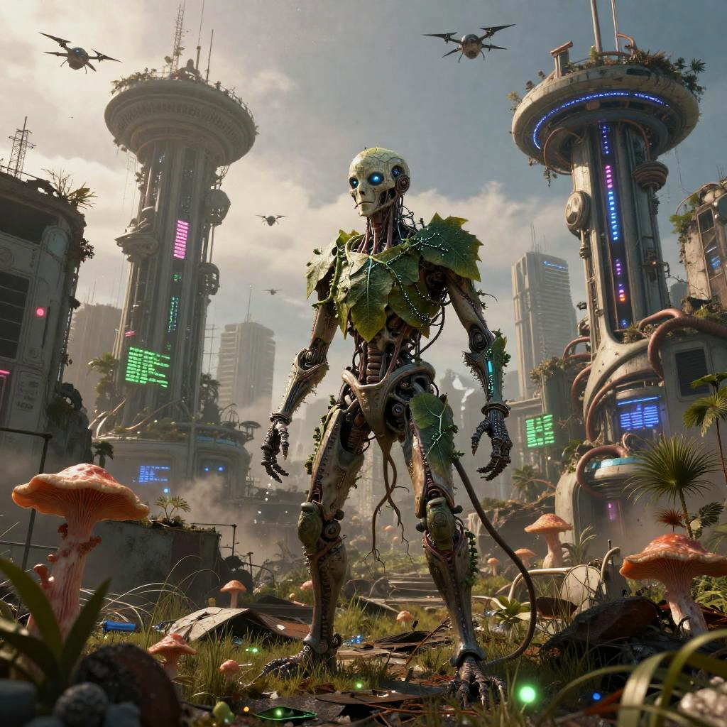 In a decrepit, overgrown metropolis, itinerant gene-gardener hides among the ruins, their body a fusion of synthetic and organic mutations. Their vascular leaf-plate armor threaded with living sequencing vines and nano-root grapplers shifts in response to danger, a testament to the unchecked experimentation of corporate bioweapon research. Fungal growths sprawl over abandoned biotech facilities, their spores whispering fragmented data to those who can decipher them. Towering over the ruins, bio-mechanical monoliths stand as remnants of failed utopias, their vascular piping still pumping a strange, viscous fluid. In the distance, swarms of gene-spliced drones patrol the skies, scanning for rogue mutations. The atmosphere is damp, neon-mottled twilight heavy with drifting spore-dust and intermittent mechanical rain.