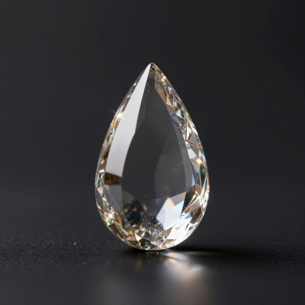 Photograph of a clear, teardrop-shaped diamond with intricate facets, reflecting light against a dark, smooth background.