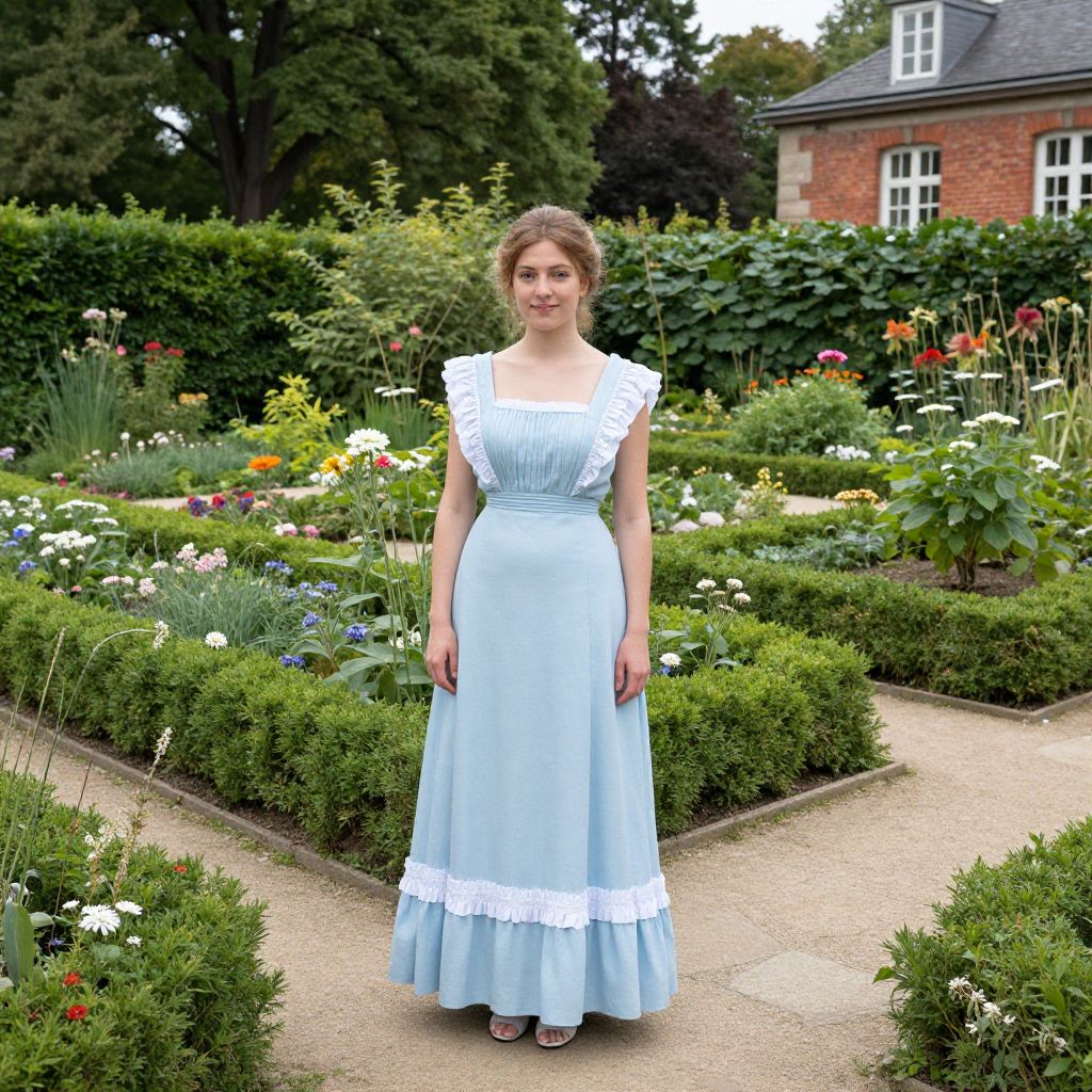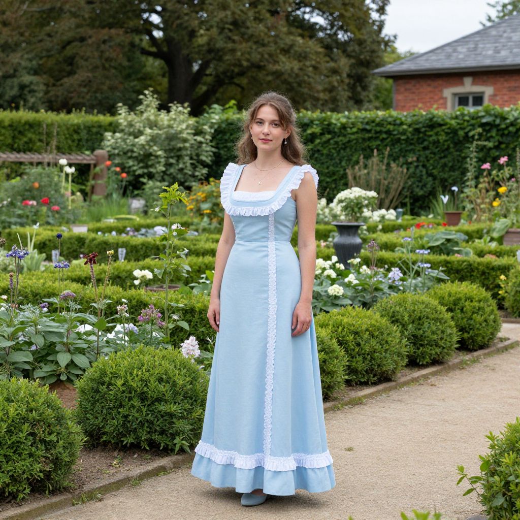 Photograph of a young woman with fair skin and brown hair standing in a lush, vibrant garden. She wears a light blue, floor-length, sleeveless dress with white lace trim on the square neckline and hem. The dress has a central vertical seam and white buttons down the front. She stands on a gravel path, surrounded by well-maintained green hedges and a variety of blooming flowers, including white and red roses. In the background, there's a brick house with a gray roof and tall trees. The sky is overcast, adding a soft light to the scene.