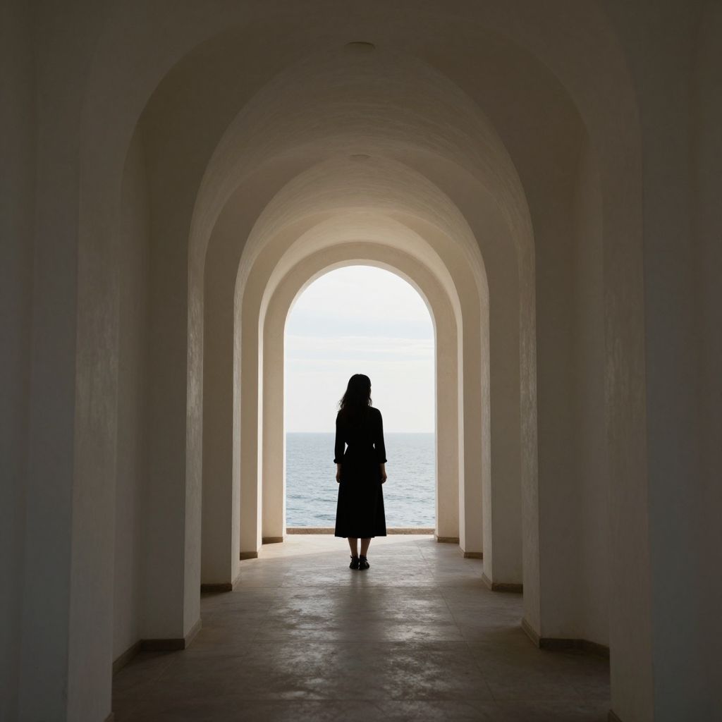 A woman stands at the end of an infinite corridor of arched doorways, her silhouette framed by cascading light as she gazes out toward the horizon where the sky meets the sea.