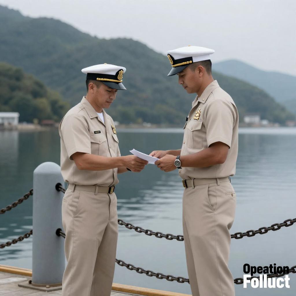 Photograph of two male Coast Guard officers in beige uniforms and caps, standing on a dock with a chain barrier and mountainous background. One officer hands a paper to the other. The scene is outdoors with a calm, reflective body of water. "Operation Fallout" is in the bottom right corner.