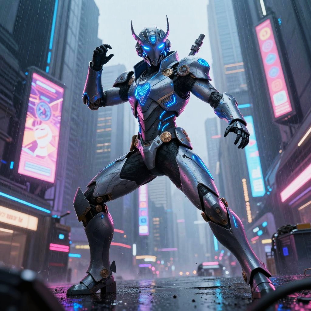 Photograph-like CGI of a futuristic, armored humanoid standing confidently in a rain-soaked, neon-lit city street at night. The figure wears a sleek, metallic suit with glowing blue and pink accents, and a featureless silver helmet. The background features blurred, colorful vertical neon signs and wet pavement reflecting light. The street is dimly illuminated, with a few cars and indistinct figures in the distance. The overall scene exudes a cyberpunk aesthetic, with a strong contrast between the dark, rainy environment and the bright, glowing elements.