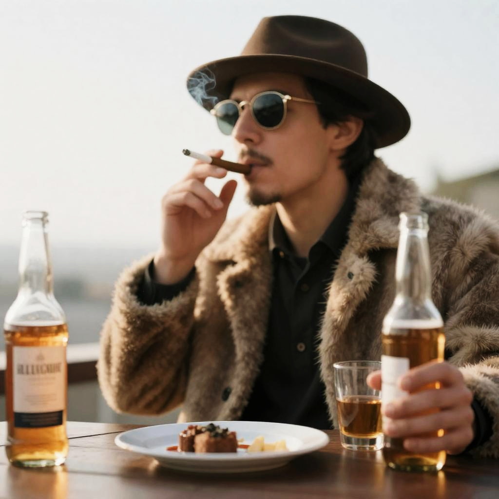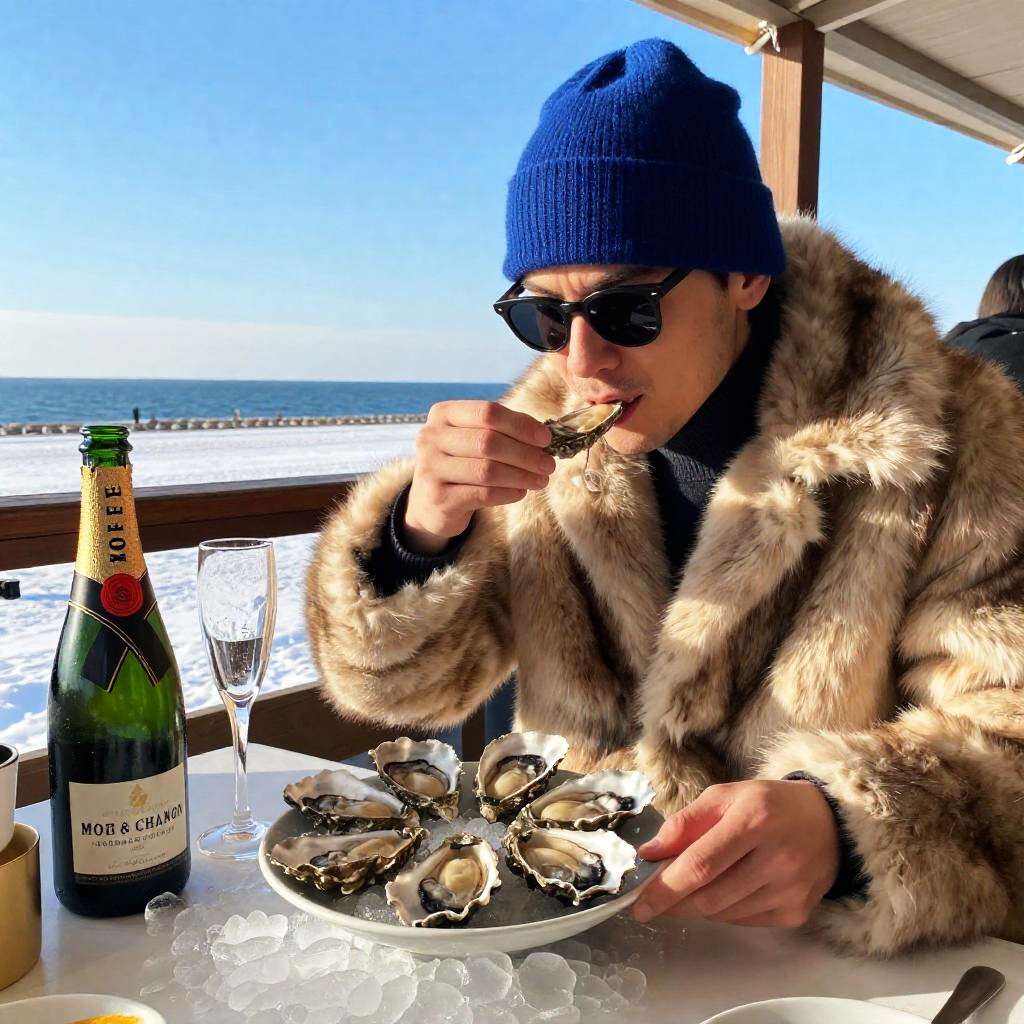 A man wearing sunglasses and a blue beanie, dressed in a large fur coat, eating oysters from a plate on a table covered with ice, a bottle of Moet & Chandon champagne and a filled flute glass next to the plate, outdoor winter scene by the sea under clear blue sky, cozy and rustic atmosphere, natural lighting