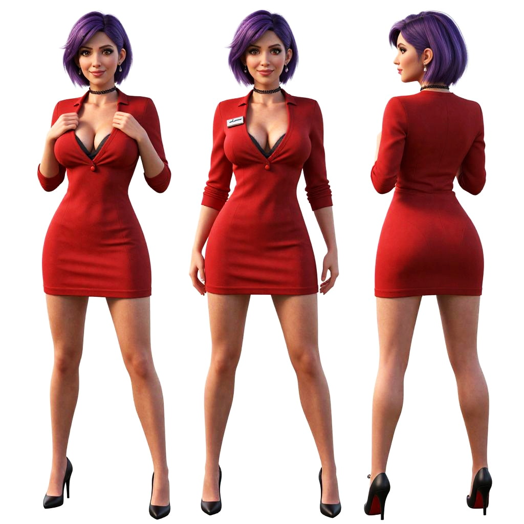 This CGI image features a woman with short purple hair, wearing a form-fitting, red, long-sleeve mini dress with a deep V-neck, revealing ample cleavage. She has fair skin and is standing in three different poses: front, side, and back. The dress is paired with black high-heeled shoes. She wears a black choker necklace and has a name tag on her left chest. The background is completely white, emphasizing the character's attire and poses. The CGI style is highly detailed, with realistic textures and shadows, highlighting the dress's fabric and the woman's curves.